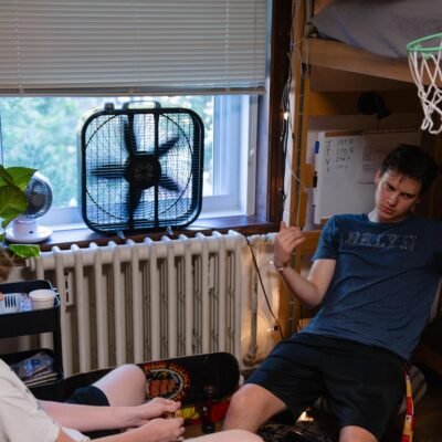 Trevor Deering and Justin Fallon, both freshman in mechanical engineering, sit next to the fans in their dorm window in Roberts Residence Hall, Aug. 26,
